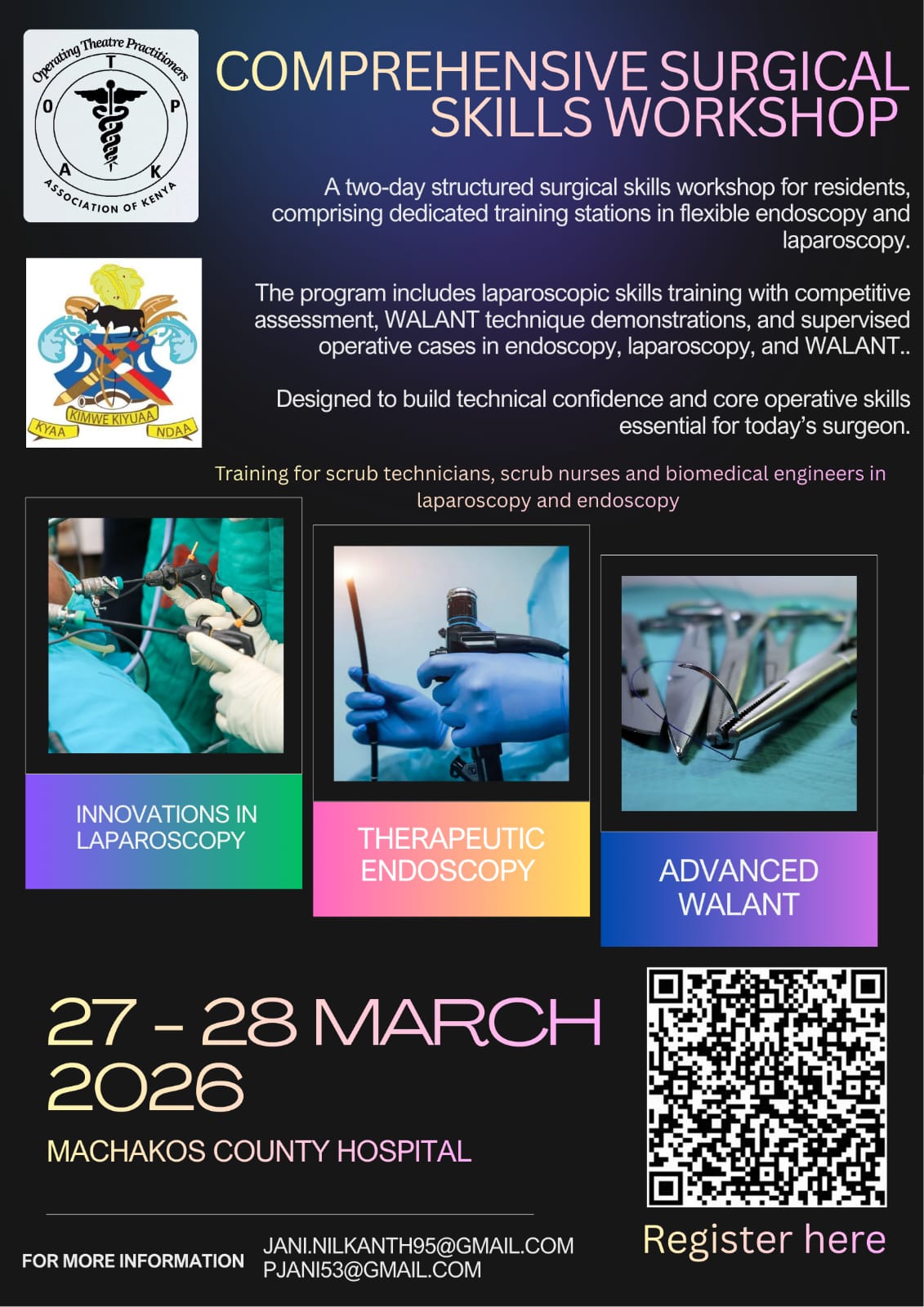 Join us for a hands-on surgical skills workshop designed specifically for residents, scrub technicians , scrub nurses and biomedical engineers focusing on Laparoscopy, Endoscopy, and WALANT techniques.